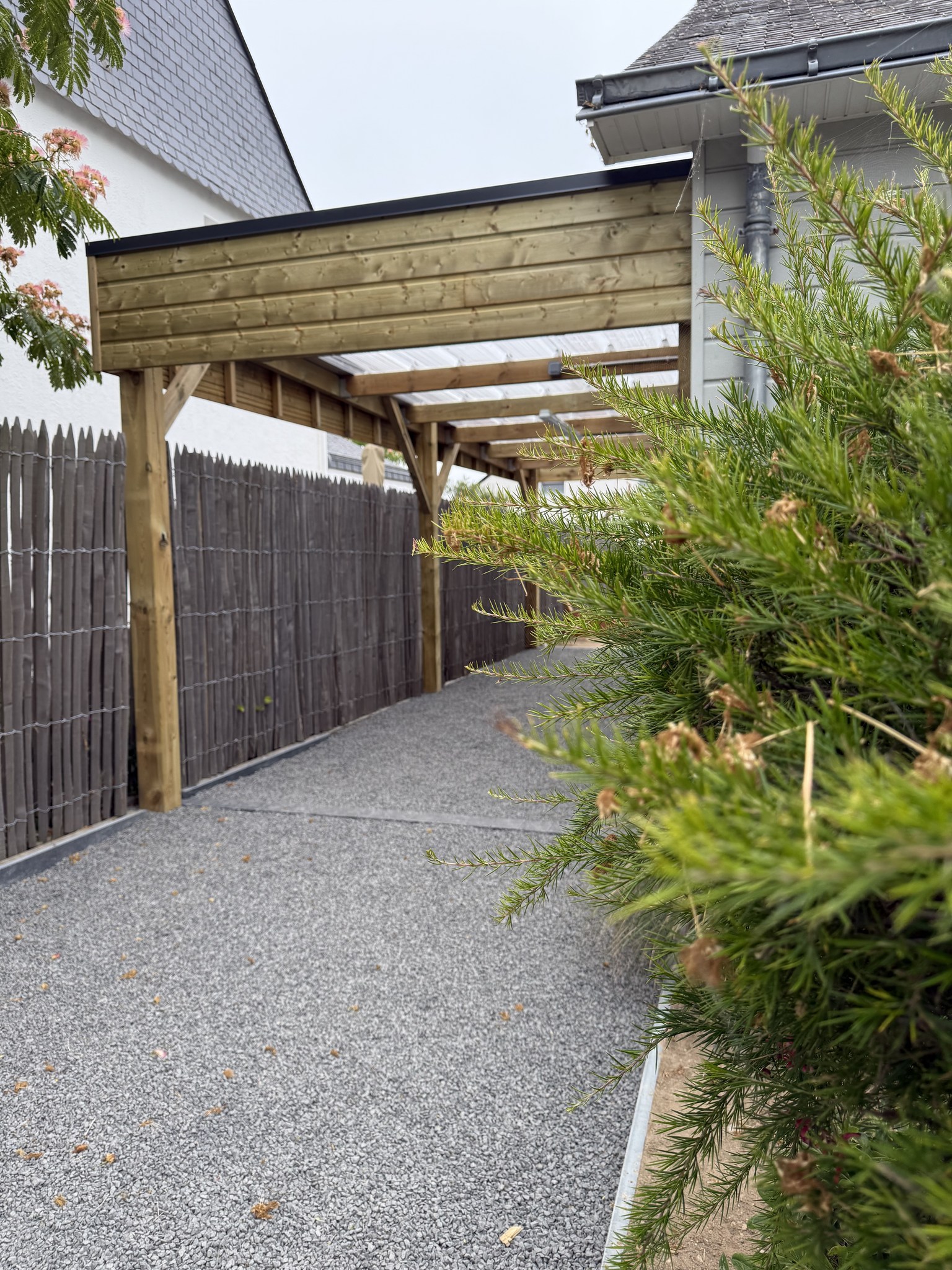 Un simple chemin…devenu un espace structuré, pratique et esthétique grâce à la pose d’un carport bois et gravier en Nidagravel 💡